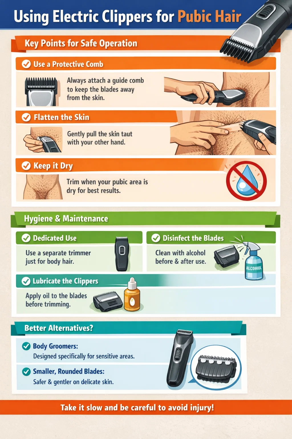 Utilice siempre un peine protector: Este es el punto más importante. La piel del área púbica es muy suave y el uso de la hoja de metal directamente contra la piel puede provocar pellizcos fácilmente. Se recomienda colocar al menos un peine guía de longitud corta. Esto acortará el cabello y mantendrá las hojas afiladas a una distancia segura de la piel.