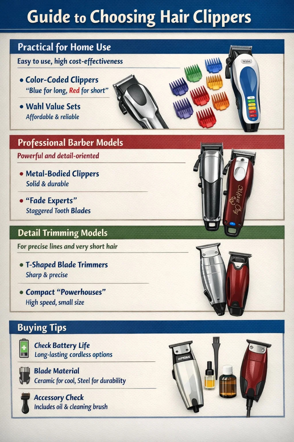 Cortapelos codificados por colores: la característica más fácil de usar de estos cortapelos es que los peines guía están codificados por colores. No es necesario recordar números complejos; solo recuerda "el azul es para cabello largo, el rojo es para cabello corto" y toda la familia podrá usarlos fácilmente.