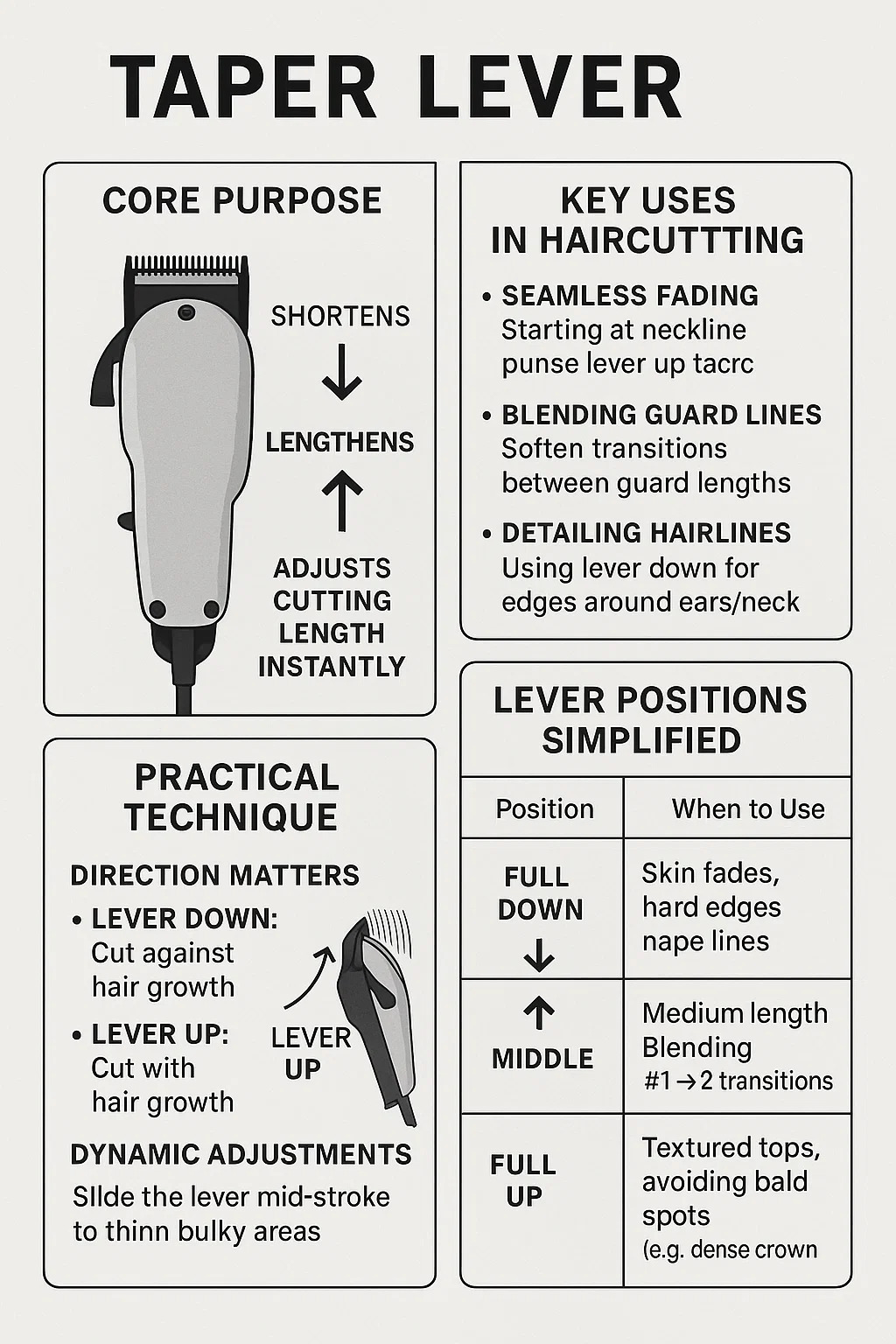 la palanca en cortapelos (a menudo llamada palanca cónica o palanca de ajuste de la cuchilla) cumple una función precisa esencial para los cortes de cabello profesionales. A continuación se muestra un desglose práctico: